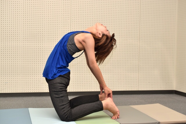 背中を後屈させ、胸を大きく開くポーズ。肩、腰の柔軟性、姿勢改善、バストアップにも効果あります。無理をせず、かかとに手がつかない場合は、上体を反らし、胸を開くだけでも大丈夫。腰を痛めないよう気を付けましょう。