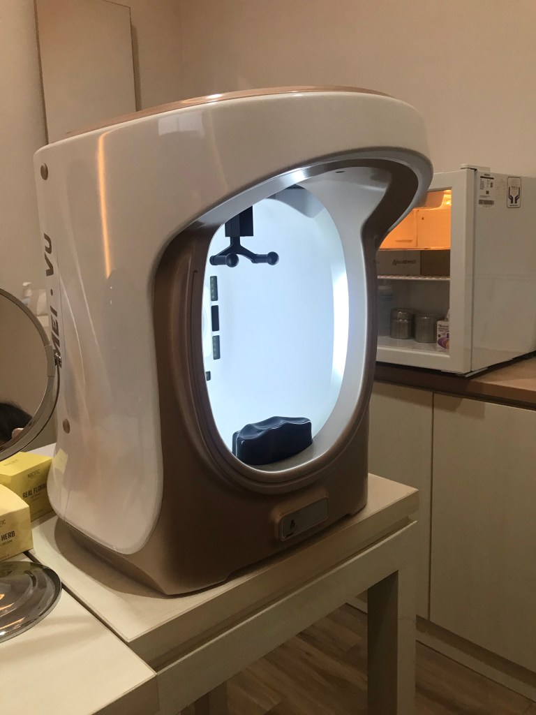 私がHIFUをしてみたい事、今の悩みを話すと、機械で肌のシミや毛穴、水分量などを計測してわかりやすく説明してくれました。(言葉は英語かインドネシア語です。)