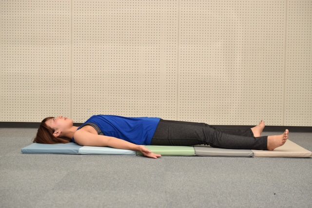あお向けになって全身の力を抜ききる完全休息のポーズ。