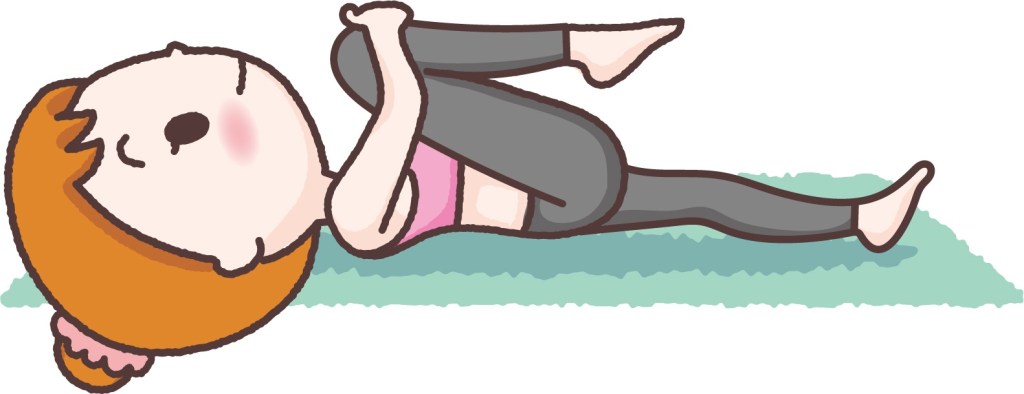 ⑤両側終えた後、次は両膝を曲げ、両手で膝をかかえ呼吸を続ける。