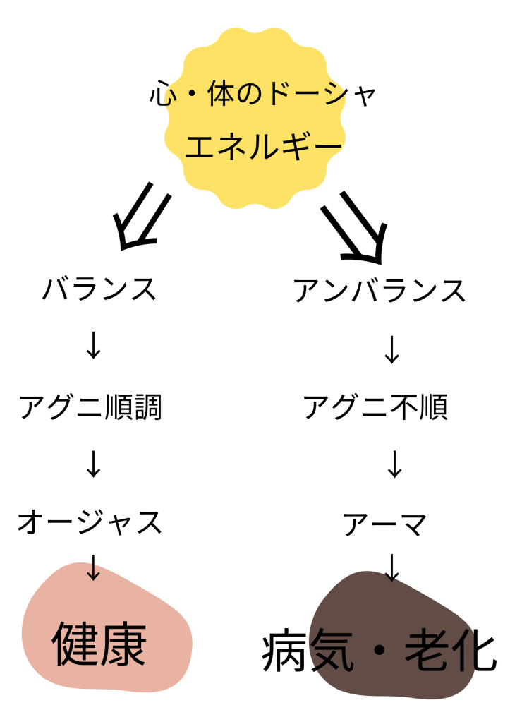 つまり、心のドーシャであるラジャスとタマスが増大し過ぎると心のアグニ(消化の火)が不調になり心のアーマ(未消化物)が蓄積し、それが心の病気を引き起こす素になります。