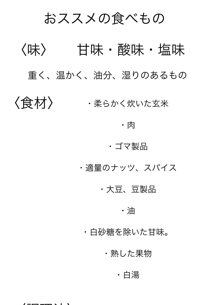風と空のエネルギーである、動性、軽性、乾燥性などの性質とは反対の属性を持つ食材や食事法を選ぶのがポイント。