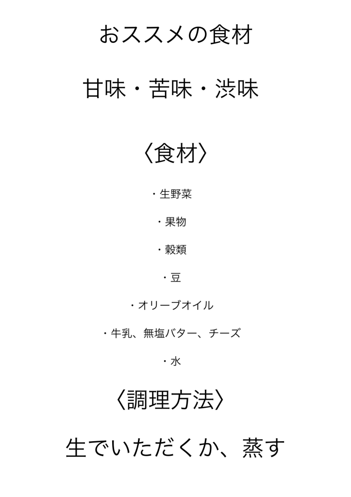 ピッタのバランスをとる食材の味は甘味、苦味、渋味です。
