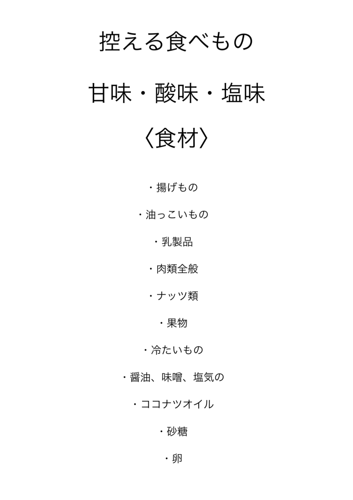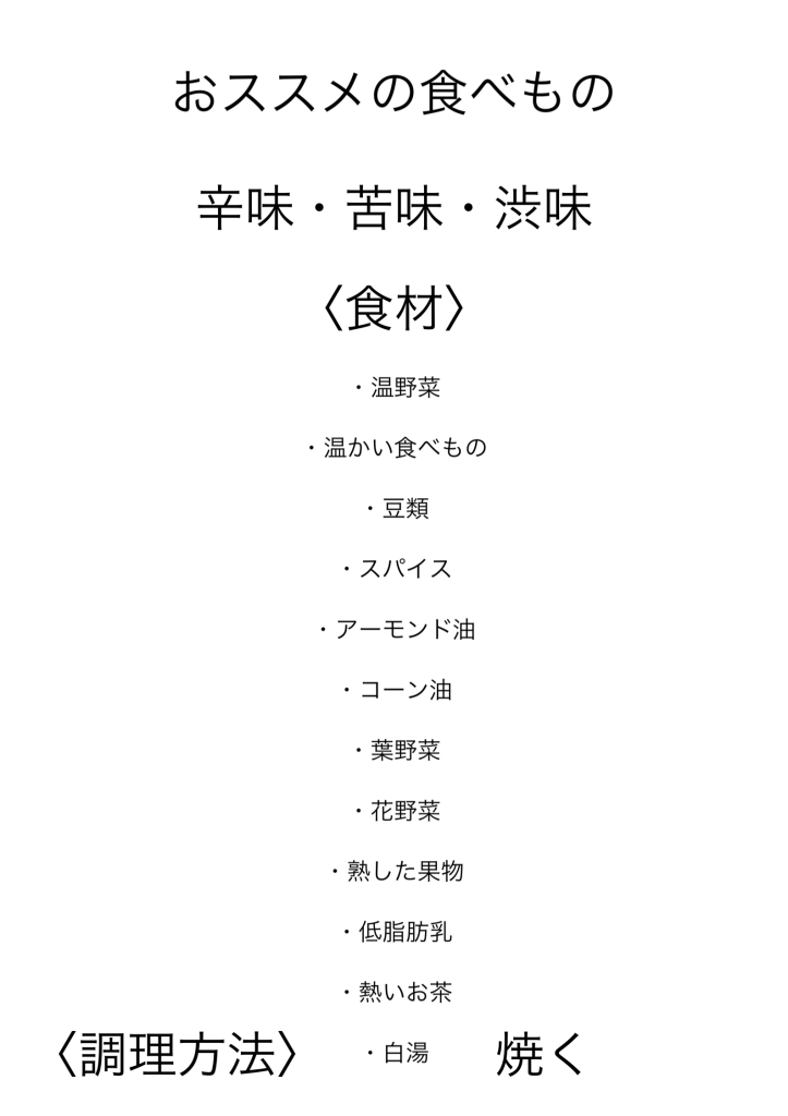 特に気をつけるのは、カパの時期(冬から春にかけて)は甘味、酸味、塩味の食べものは少なめに。