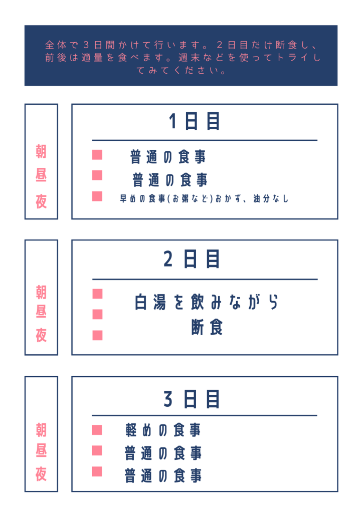 しかし、断食は初心者には難しく負担も大きい為、3日間かけて行うプチ断食がおススメです。